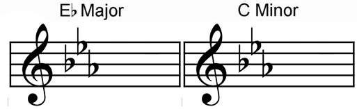 Next=>> You have learned how to spell the major scales for all of the major keys. There is also a set of minor keys that have scales you must learn to spell. The good news is that you already know almost everything you need to spell the natural minor scales for the minor keys. In this Focal Point you will be introduced to the secret to spelling the minor scales, which is the relationship between the relative major and minor keys. Relative Major and Minor Keys Each major key has a minor key with the same key signature. This minor key is called the relative minor. It is easy to find the relative minor for any major key. This is because the note name of every relative minor key is ALWAYS a minor 3rd below the letter name of the relative major key. Since you already know how to find a minor 3rd below any note, you can easily find the relative minor for every major key. If you do not know, please stop here and take the free online course at https://socraticmethod.net/music_theory to learn how to find minor 3rds. Since many people reading this book will have taken the online course, the following lesson will use language presupposing a knowledge of the course. However, if you did not take the course and still know how to find minor 3rd, you can still read past it without confusion. The relative minor of Eb Major is C Minor. (C is a minor 3rd below Eb.)